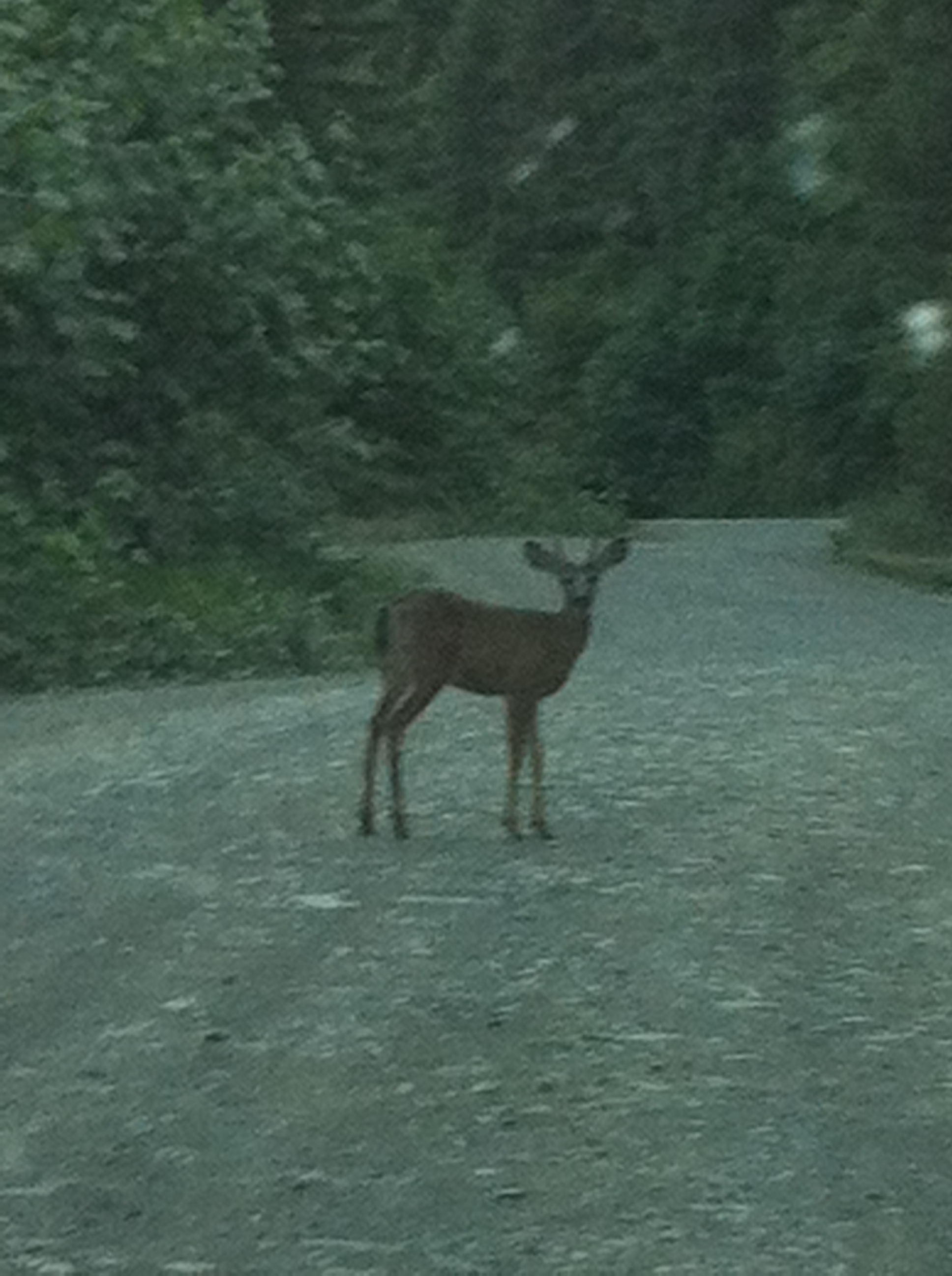 I called a couple of friends who are intersted in the area for their ATV adventure tour business, and after hearing my description of the Bear Creek trail, asked if I'd take them up for a look on Sun. morning, so I repeated that portion of the trip with them, heading out at 6AM, to avoid the worst of the afternoon heat. Just a few km up the main road, we saw a young Coast Blacktail buck, his velvet antlers not yet as tall as his ears. I got a dim picture of him in the morning light, then we continued to Bear Creek. Thomas and Bill were impressed with the panoramic views, and even more impressed when we rounded a bend in the trail to see the hind end of a long legged reddish brown bear hightailing away into the timber. The sighting was so brief, just 3 or 4 seconds, that none of us was able to get a picture, even though our cameras were handy, and from the rear view, we couldn't tell if it was a black or a grizzly. By noon, the smoke from multiple forest fires further inland was filling the valley, so we headed back to town for lunch at the pub.