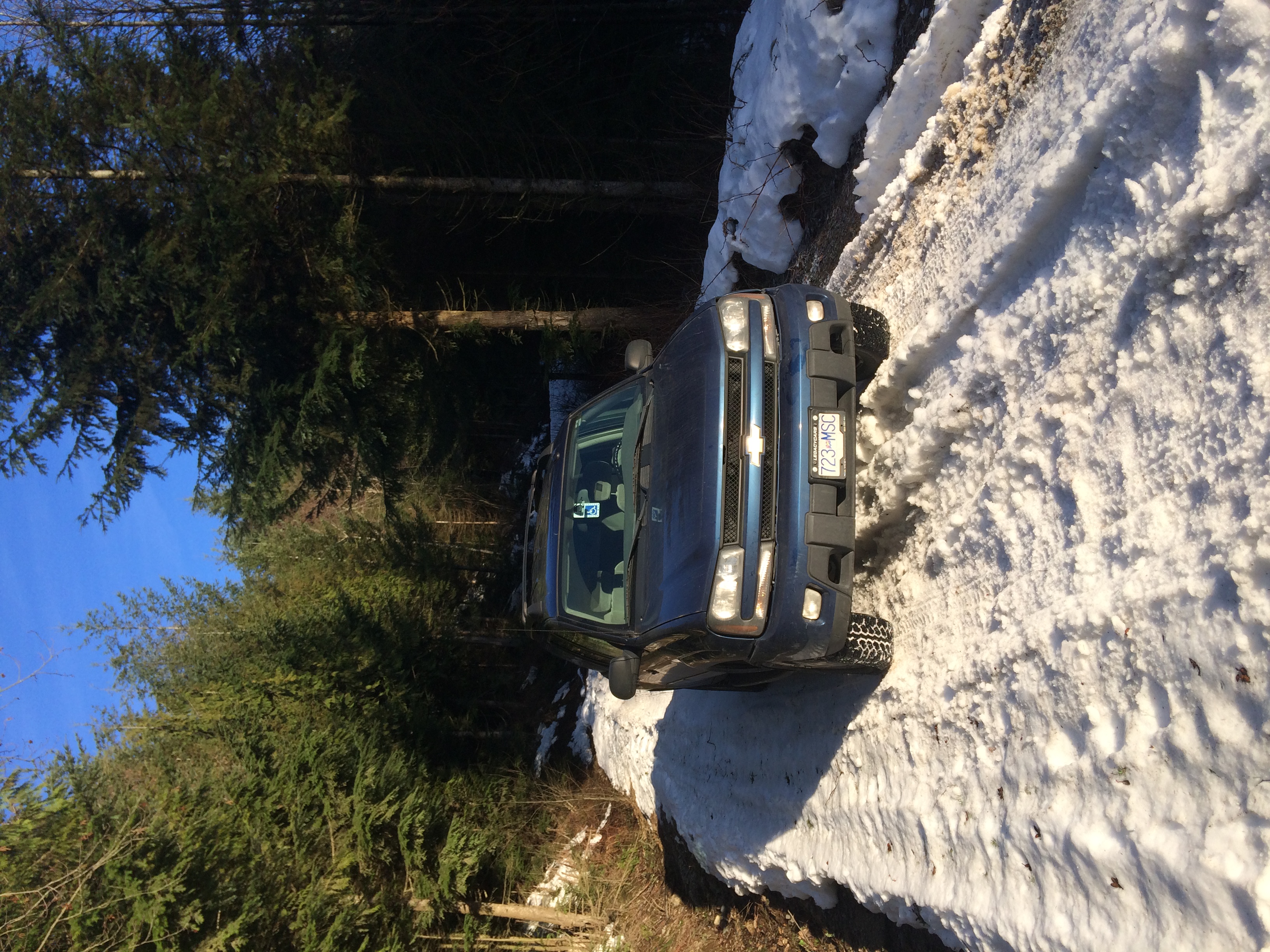 In my run up there today, I met only one other vehicle, a small "cute ute", on it's way down, and we both managed to pull over out off the ruts in the compact snow enough to get by each other without getting stuck. The snow increased in depth as I climbed higher, eventauly passing the turnaround point of the other vehicle at km 3, from which point the only tracks on the road were from skidoos and atvs. I was truly impressed with the traction of the Motomaster Total Terrain AT2's that I fitted about 6 months ago, they gripped well on both the icy sections, and on the looser stuff near the parking lot at the top of the trail. This was their first real test under these conditions, and I've had other AT tires that would not have made it up there. The drive back down was scarier than the climb, as the truck was now bouncing around in the ruts I'd made going up, but low gear in 4 high was enough to keep from getting too fast. I made it out to the gate before lock-up time, which is 6PM this time of year, and got home in time to start supper for my daughter, who arrives home from her commute about 7.