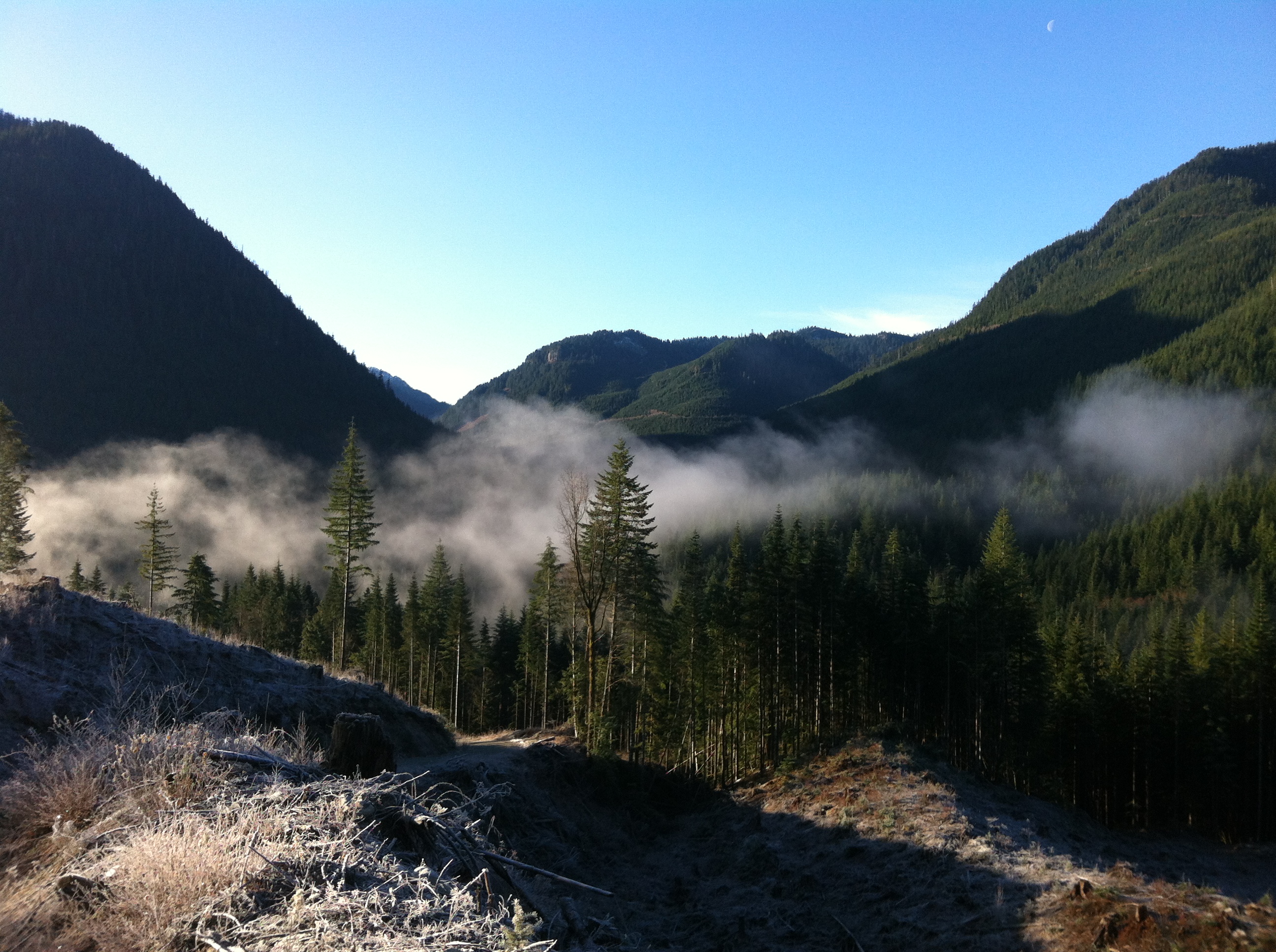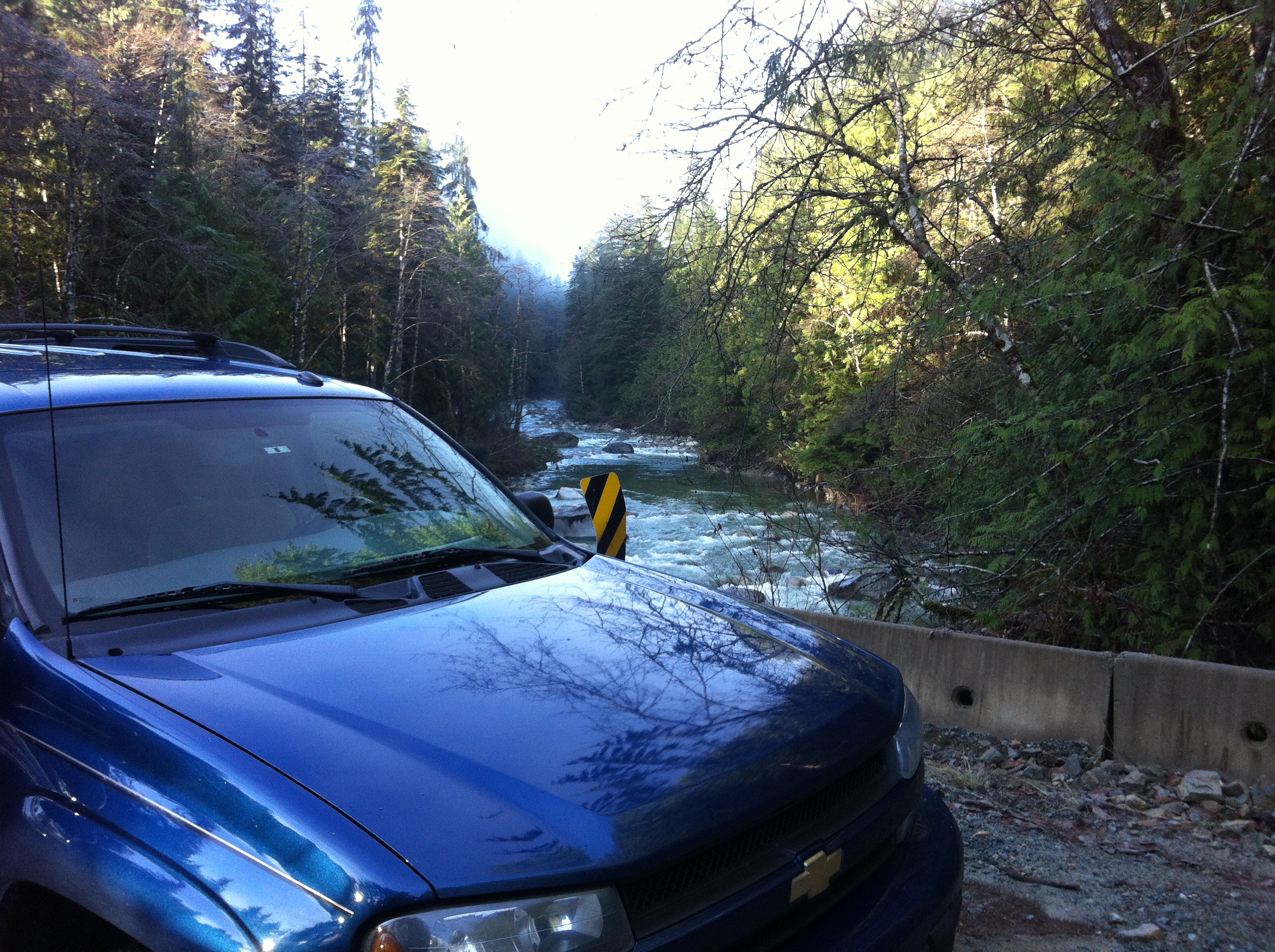 I headed out with a couple of buddies today in my TB, to have a last try for mule deer (actually coast blacktail, but they are listed under the same regs). We chose the Chehalis River valley, as it's only about 30 min. from home, and has a good main logging road in, with lots of side branches. Our only concern was what the condition of the road might be, as 9 days of torrential downpour had just ended on Friday, leaving the possibility of washouts or slides. As it turned out, that was not a problem, but the large number of blowdowns was, at least on the side roads. I guess the logging contractor had cleared the ones on the main road, but not yet made it onto the smaller ones. We didn't have a chainsaw along (yeah, I know, dumb move!), so had to turn around at each block. Even so, the weather was perfect, it was great to be out there with friends, and I snapped a few pics.
