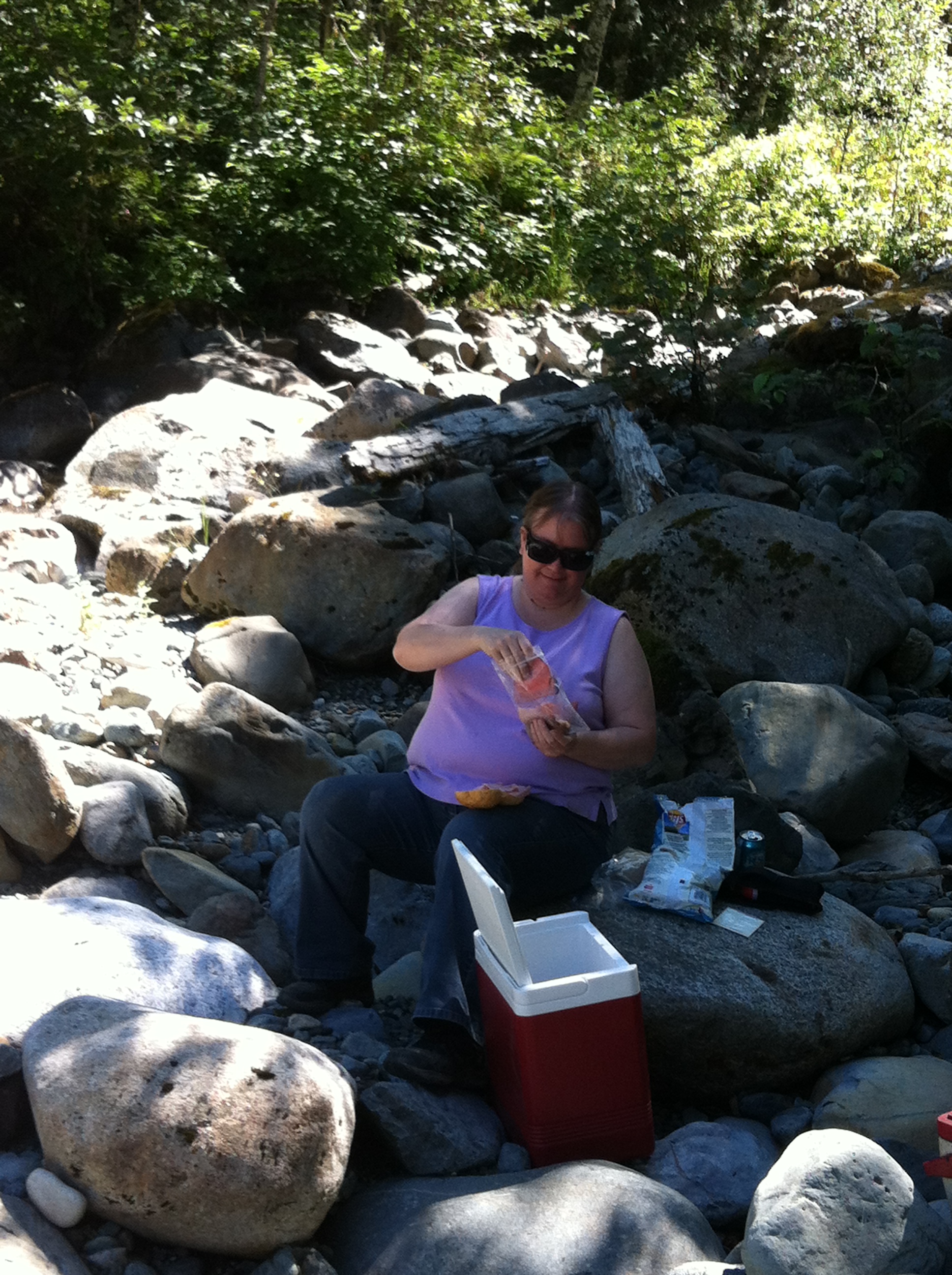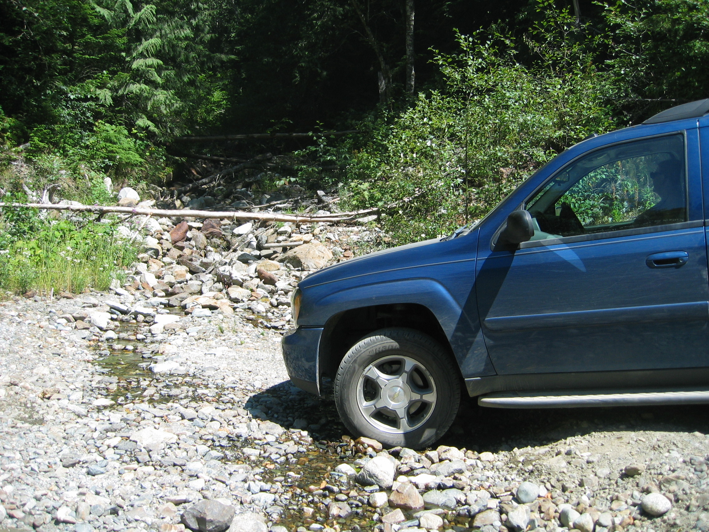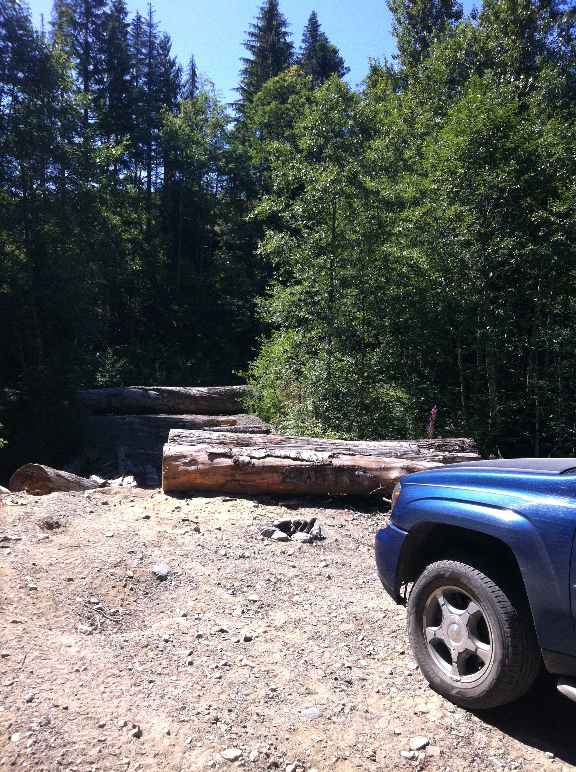 I finally got the spare wheel on, and the blown one thrown in the back, wound the winch cable up so it wouldn't flail around under there, and carried on up the trail, praying that would be the only flat today. We got to the end of the usable trail when we encountered several huge logs placed across the end of an old log bridge. We walked across the rotting old timbers, plenty strong enough for 2 people, but certainly not safe for a vehicle. On the other side, we found a trail down to the creek side, in a shady spot, so I went back to the truck and brought the cooler down so that we could have lunch in the cool air, near the running water. The home made potato salad and cold cuts, with fresh apricots for desert were delicious, and fuelled us up for the drive back out to pavement, and home to a good scrub down, after battling the alder branches and flat tire. It was a great little mini-adventure, and as soon as I have the tire/wheel replaced, we'll be ready for some more outdoor fun.