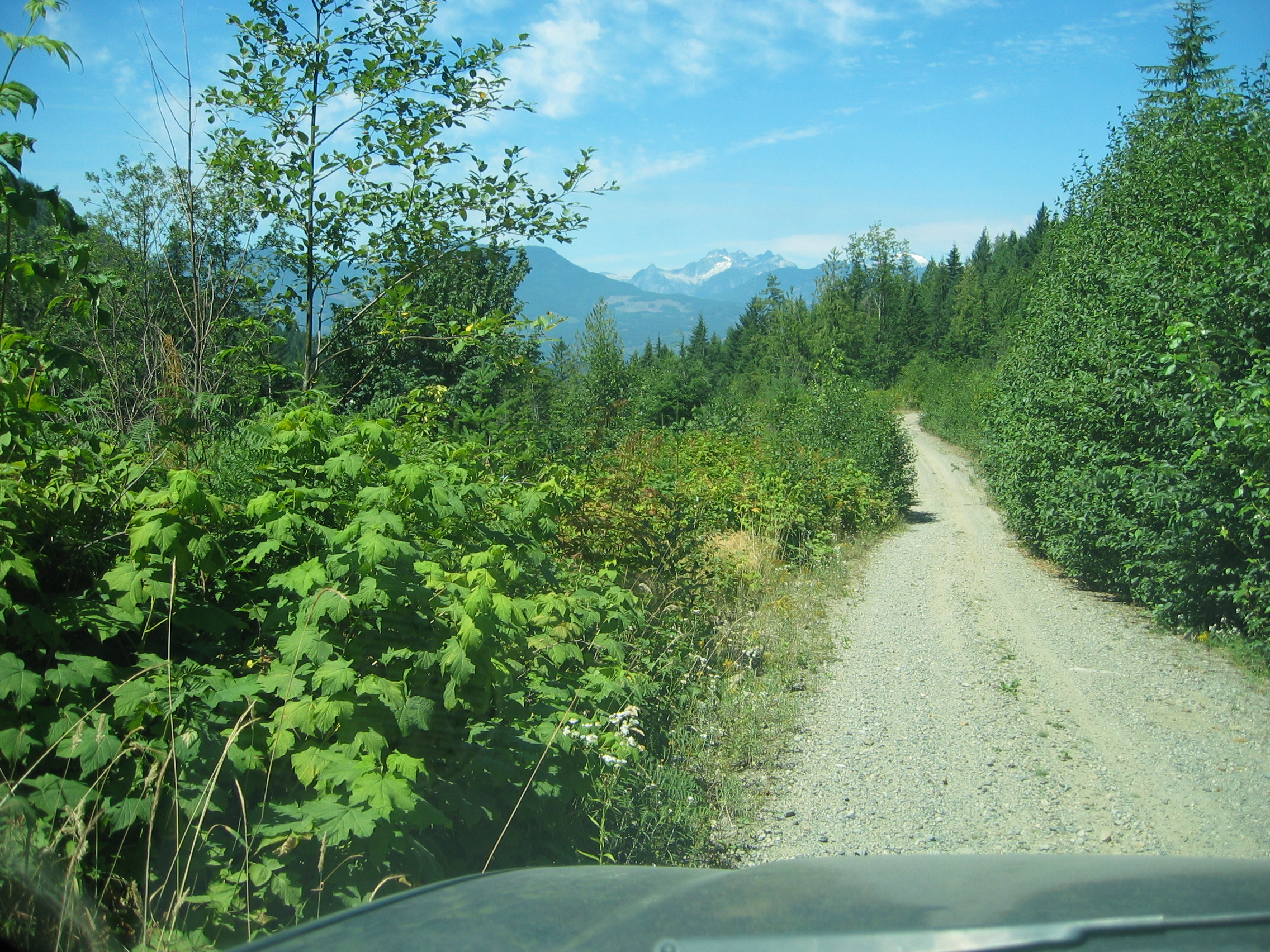 My daughter and I met up with friends Bill and Thomas to do a little trail maintainence, clearing some of the overgrown alder branches from a route that Bill uses in his adventure tour business, then to continue our exploration of the Bear Creek logging road, now disused, but still in pretty good shape. We followed Bill's Polaris Crew ATV into the tour route, with them trimming the right side of the trail, and us whacking away at the left side. In a matter of 2.5 hours, we had the work done all the way to the lookout at the turnaround point of the tour trail, and stopped to chat and have some cold drinks in the heat that had already hit 85 at 10 AM, while washing off all the bugs we had accumulated fron the tree whacking. They headed back to Harrison, while Andi and I took a short cut back to the main FSR, then went another 5 km to the Bear Creek turnoff.