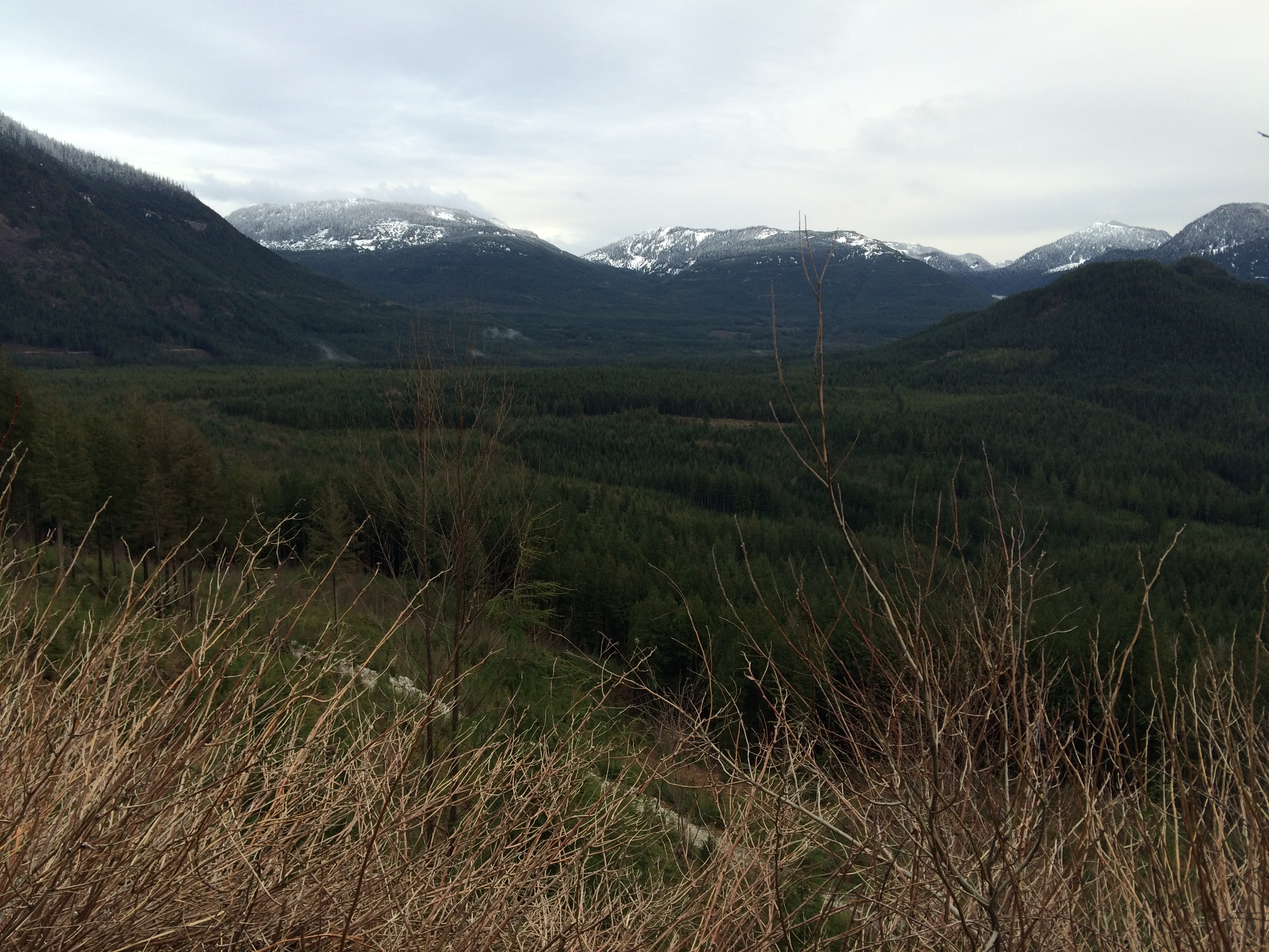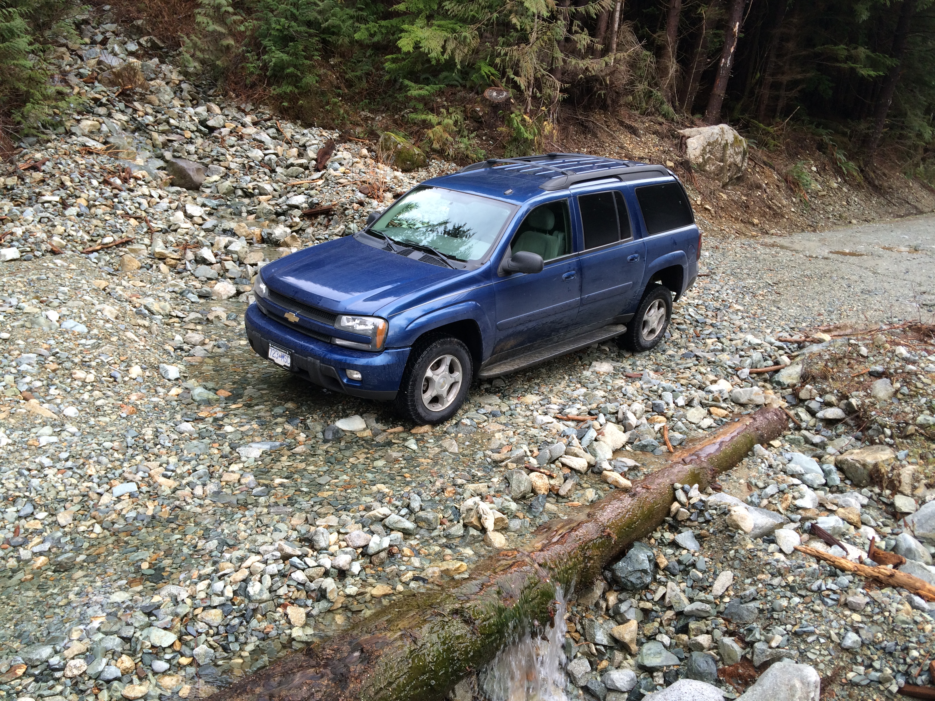 Tuesday afternoon, Mar 8th, I had about 4 hours free time before sunset, so I took the opportunity to head for a local logging road to try out my new tires. The Lost Creek/Davis Lake FSR is about 30 min. from my home via Hwy 11 and Hwy 7, then 10 km N on Sylvester Rd., a nice curvy 2 lane asphalt along the base of the mountains. Once at the FSR, you're immediately on hard packed gravel, with lots of washboard and puddles, due to our very wet weather the last few months. At the 10 km mark, the road is not in a current logging area, so not maintained at all, and becomes much rougher, with washouts and brush grown in to narrow the track to just barely one lane. I drove another 15 km, to the point where a creek had cut through the trail to a depth of about 6 ft, with vertical banks, before turning around for the trip back out. The entire trip was done in 2 wheel drive, except for 1 deep creek washout that required a right angle turn in the middle to climb out the far side, where I lost traction at low speed. On the return run through here I was able to get across in 2wd, by going just a little bit faster