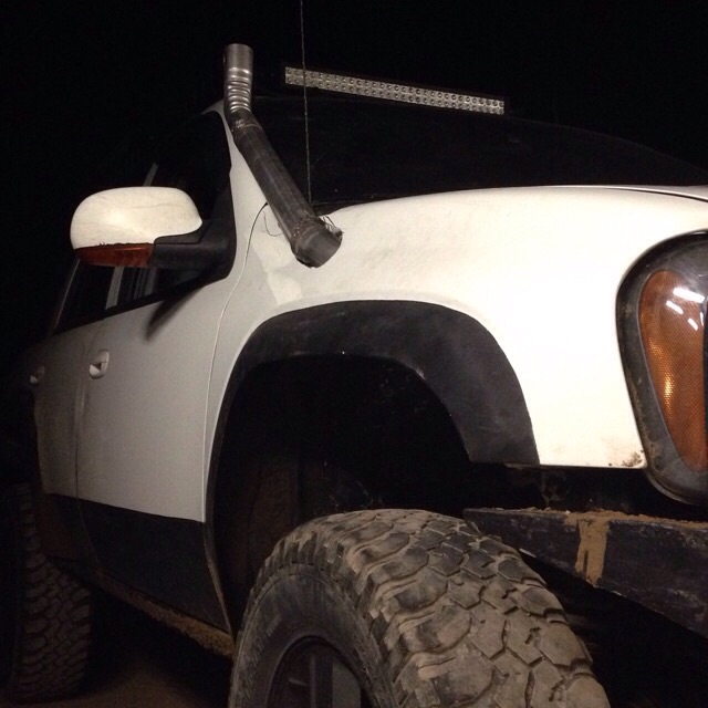 Alright, I did manage to get it dressed up. The pre filter is on and it's much much happier with that than the one I made. That pre filter is actually really affective. It's been on for about 2 days now and it's already collecting dirt particles instead of the filter doing it. I didn't read into how to clean the filter or if I even can, this was a "on a wim" mod. I initially started by making engine bay room by deleting every single unnecessary thing under the hood. The clutch fan, all a.c. Crap, found replacement washer and coolant tanks so I could relocate them. The shroud, the a.c. Line bracket, and any plastic minus the one that covers the coil pack wires. So, I pulled my fender... I purchased the scepter inline air filter off of Amazon for 38 bucks. It's actually built really well. I was surprised at the quality. It came with a HR cone filter which I had never heard of, but it does the job. I then purchased a 3' section of exhaust pipe in 2.5" OD. I also got a 90° in 2.5 OD for inside the fender and outside the inner fender well+ a 45° bend for the top, it's almost perfectly level. I tempted in the 3" pipe straight to the fender from the throttle body and mashed the circle... Then the hard part came, stabbing a hole lol. I drilled from the inside of the fender week basically where the coolant tank was straight through with the hole saw. Placed ask the loose snorkel parts in place to get an idea of where everything would land. With the outer side of the inner fender well not showing the snorkel to snug up as tight as possible I had ti make the hole a square. Then I was running into the hood hinge mount and the antenna bracket which I cut a little bit to get that little bit extra tightness.They don't make snorkel in 2.5" OD that I know of and the pre filter I ordered was for a 3", which is the common size. All I did was cut a piece of rubber to size to seal and make up the size difference. Almost everybody has a CAI now and you know that engine roar you get with it?, With that snorkel it definitely is breathing good because it roars at almost all rpms. It honestly feels the same as my old cold air did in terms of acceleration and engine power. I must say I'm very pleased with it. I haven't had a problem yet. I still have the "miscut" in my fender to fix such will be a learning curve in body work for me. And I still need to get a full piece of 3" pipe to go from the throttle body to the inline filter housing. I have one too many connections right now which you will see in the pics I throw up. And yes James I do have some with fever off lol. Over all, it's a really simple Mod for us. It really only took a good 4 hours to do. I'll now throw up a bunch of pictures not in any particular order lol. Please feel free to ask whatever questions you have. As I said it still needs some minor work but ot at work is killing me and mod bug is trying to fight back.