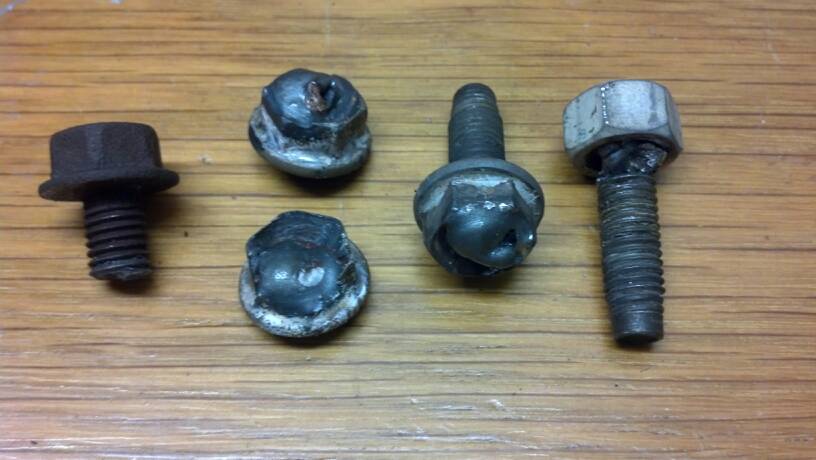 Welder. You can kinda see the progression in the image here. At left is one of the broken heads. That one broke inside the head by 3/16in or so. The other wasn't as bad and had one exposed thread, but its resting on my skidplate right now. In the middle of the picture are two of the weld attempts I made that didn't hold up. Basically, I took some nuts and counter sunk one end, so I could reach in there easier to weld the nut onto the stud. My brother had to hold the nut in place while I tacked it. The one that broke inside the head had to be built up by bumping weld into the hole until I could build up enough steel to weld the nut to. On the right are the two extracted studs, welded to the nuts.
