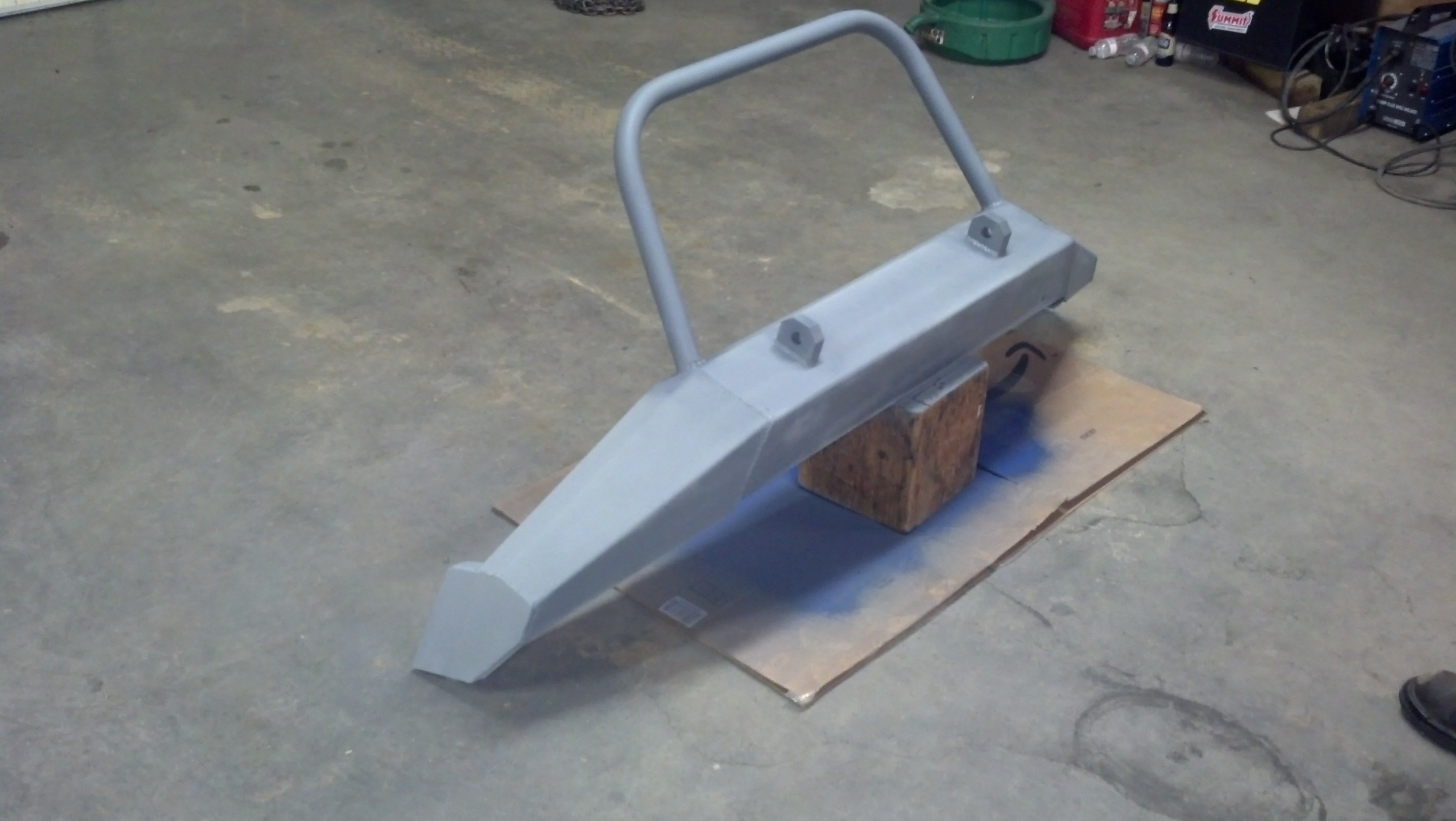 Got the bumper together and primered at about 2AM this morning so I can work on getting it sprayed the next free day. I still have the radiator skid to complete, but need to dig a bit more to figure out what's going on with the bolt that goes to the frame on the skid support, behind the radiator support. My frame doesn't have a hole for the bolt, so I'm probably just missing something.