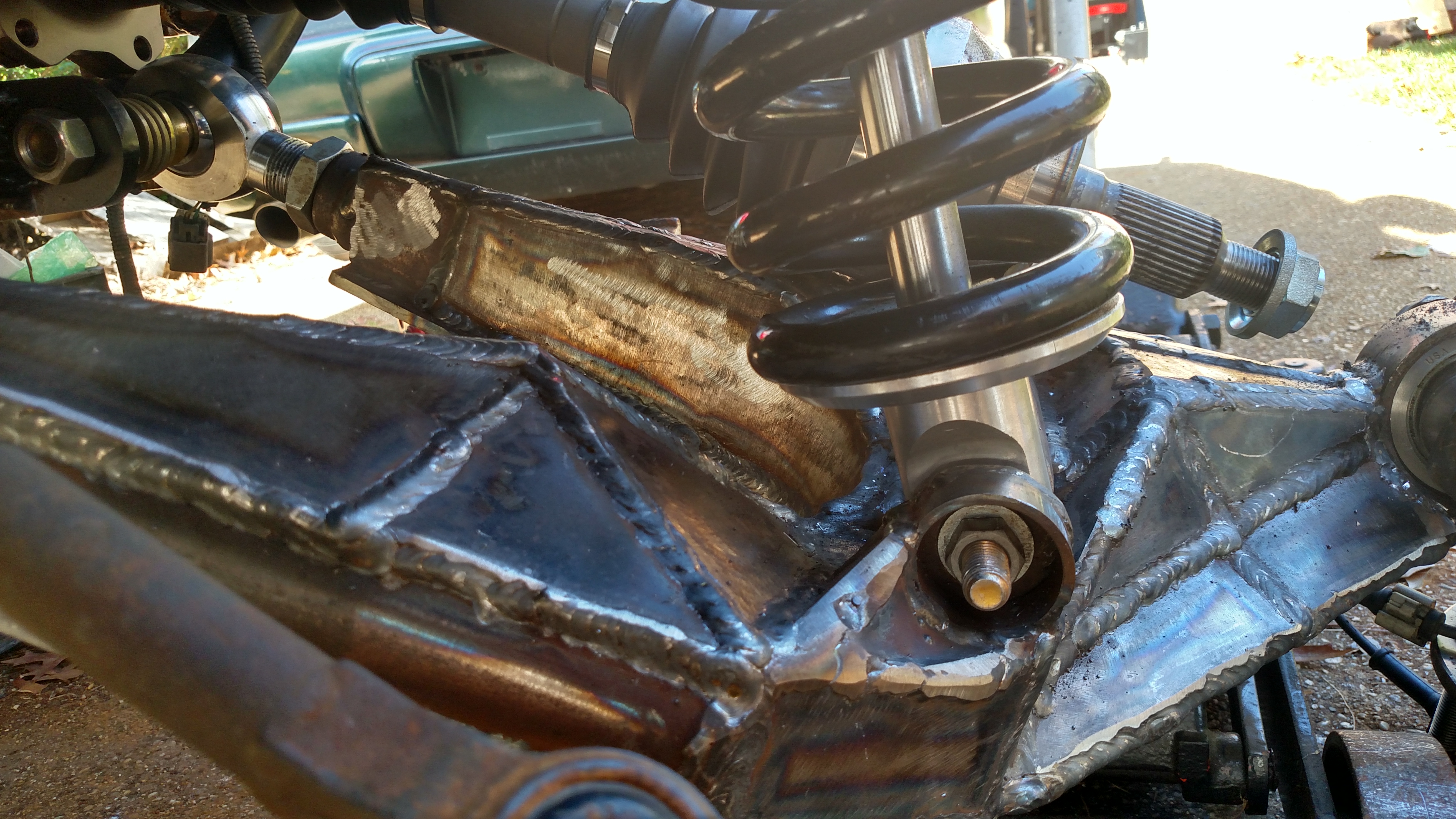 Unfortunately it's a symptom of burying the shock in the arm, there needs to be room for the spring perch as the suspension cycles. I'm still adding a bit of metal on the curved part of the A arm, should have it finished up this evening. I originally intended on mounting the shock on top of the arm, but I would've been losing room I needed for the shock.