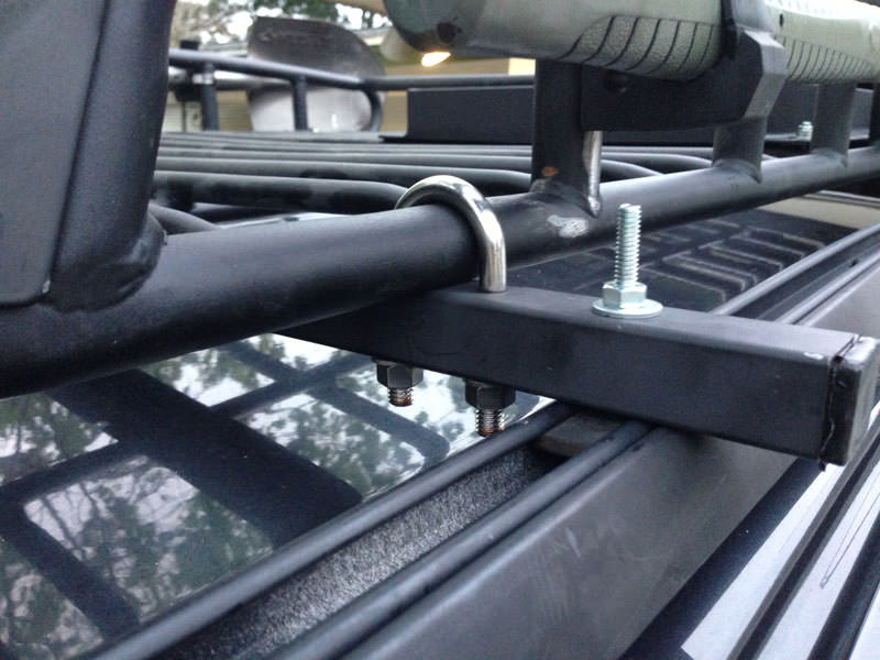 Two 48in x 1 1/4in x 1/16in square steel tubing. The plates in the roof rails are 1/4 steel plate with a hole drilled out and a carriage bolt thru it which has it's head welded to the plate. And of course, 4 u-bolts.
