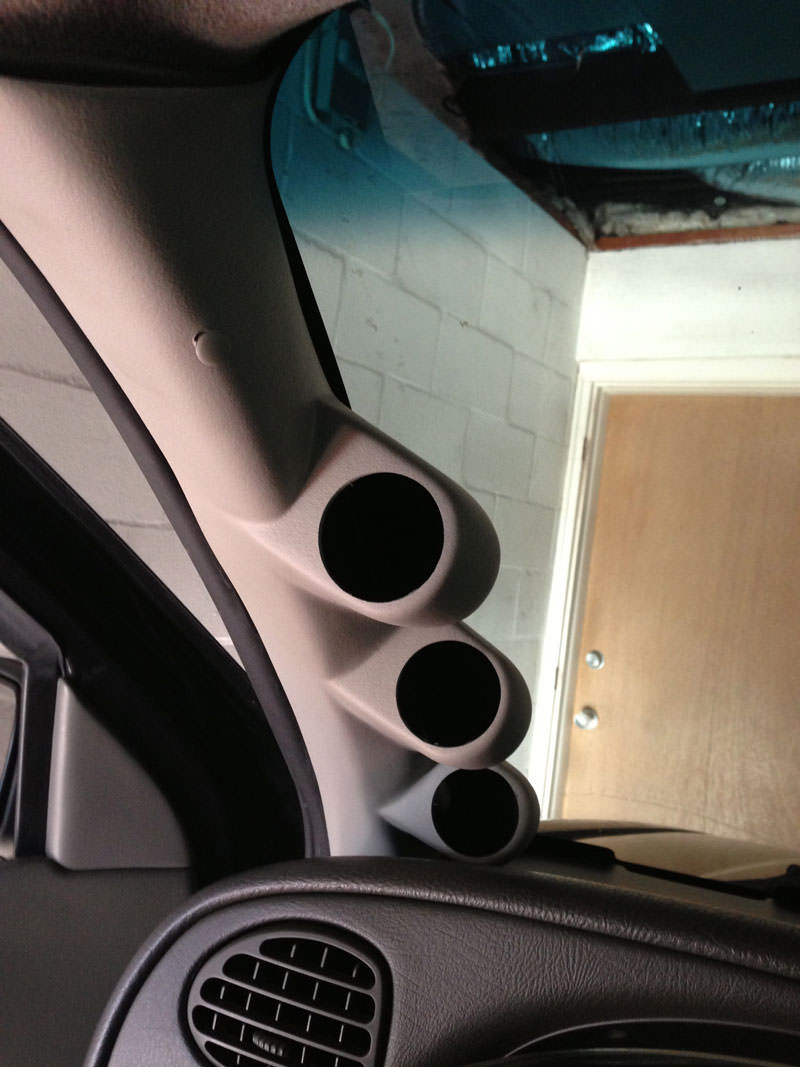 Instead of using a pod piller, I put them into Autometer's standard cup holders and mounted them directly to the stock pillar as low as I could get them. This does eliminate some of the blind spot creation that higher mounted gauges cause.