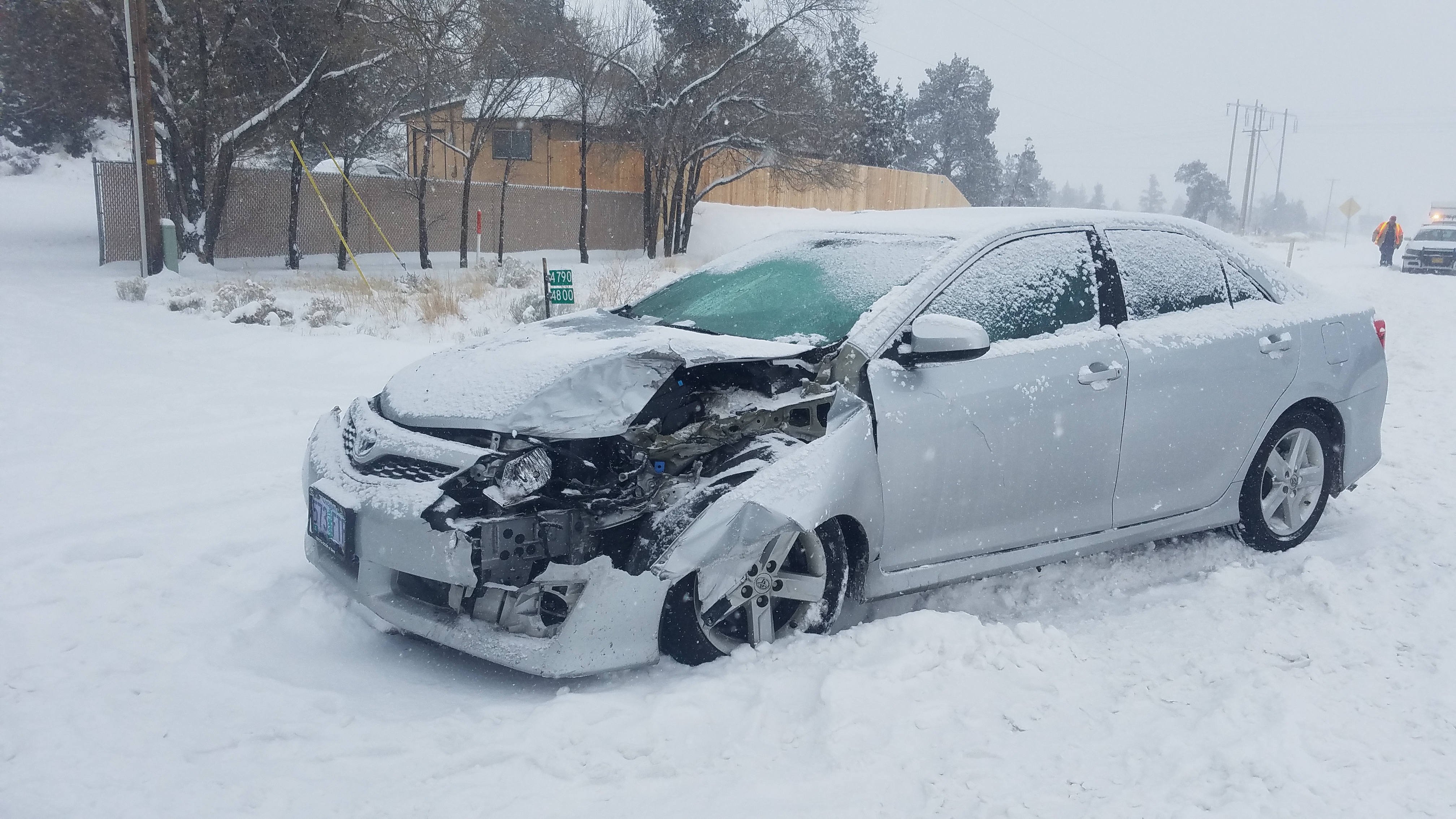 Stopped in low visibility, snow flurry conditions. 18 yr old kid doesn't know to slow down early, I guess. Anyways, his Toyota challenged MDB Fab to a thumb war.