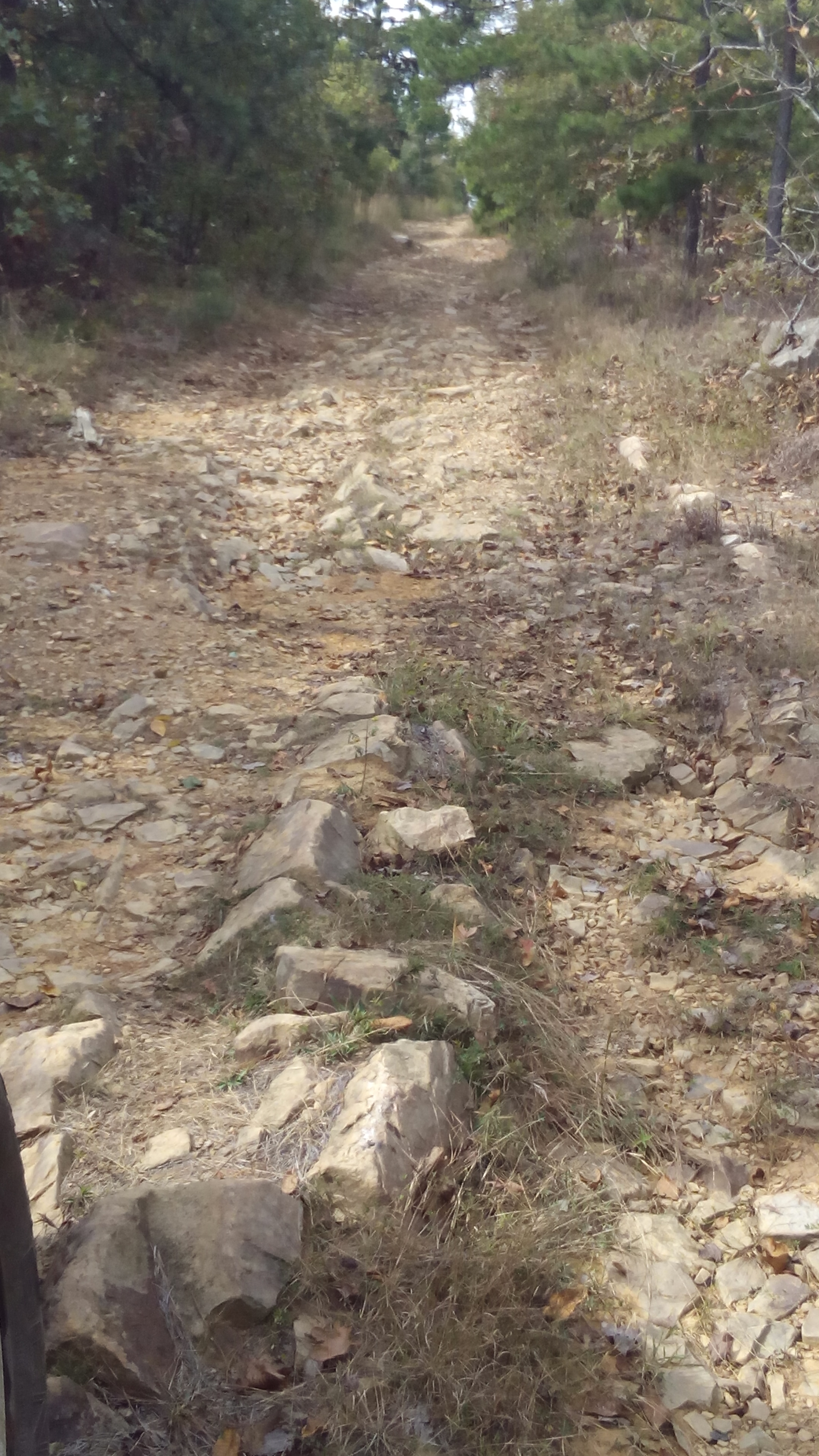 The K-trail has three sections going from Clayton,OK to Mena,AR. The western section is supposed to be the more difficult and the eastern section is mostly maintained. Since I was alone I decided to do the middle section from the Old Indian Highway to US-259. Most of the trip can be done in two wheel drive but it is slow going because of the rocks and how narrow it is. If you are picky about the paint don't go because the trees are getting you on both sides and the roof throughout most of the trip. Although the weather was nice I had to keep the windows up from the mass invasion of stick bugs. I ran into an older man up there scouting for a hunting spot who gave me some good insight on the area. I will go back with the family after hunting season and hopefully some others to do the western section as well.