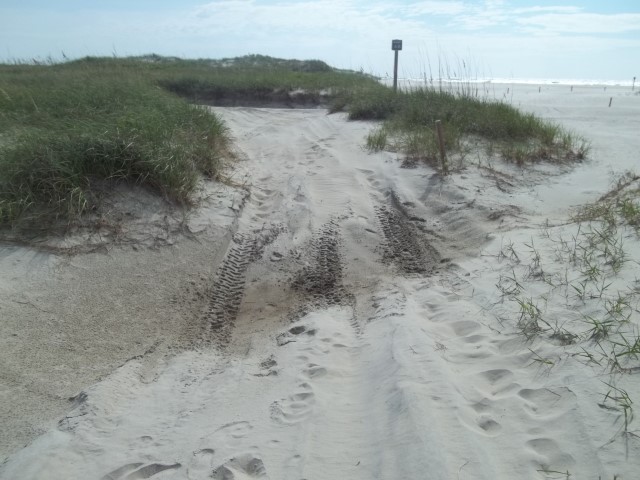 there is a trail that runs kind of in the middle of the island behind the dunes. There are about 18 miles of this trail with ramps onto the beach about every 1/2 mile.You can ride most of the island on this trail. The north end of the island begins at ramp 1a and then 1/2 mile later ramp 1b etc. The cabins are at about the 16 mile mark, 2 miles from the south end of the island.