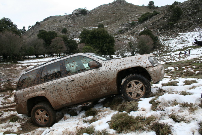 The owner of that Chevy truck in the background was like "I have as much ground clearance as you do! I can do that," and then proceeded to try. A minute or so of tires spinning and general failing later, he discovered why lockers are a good idea.