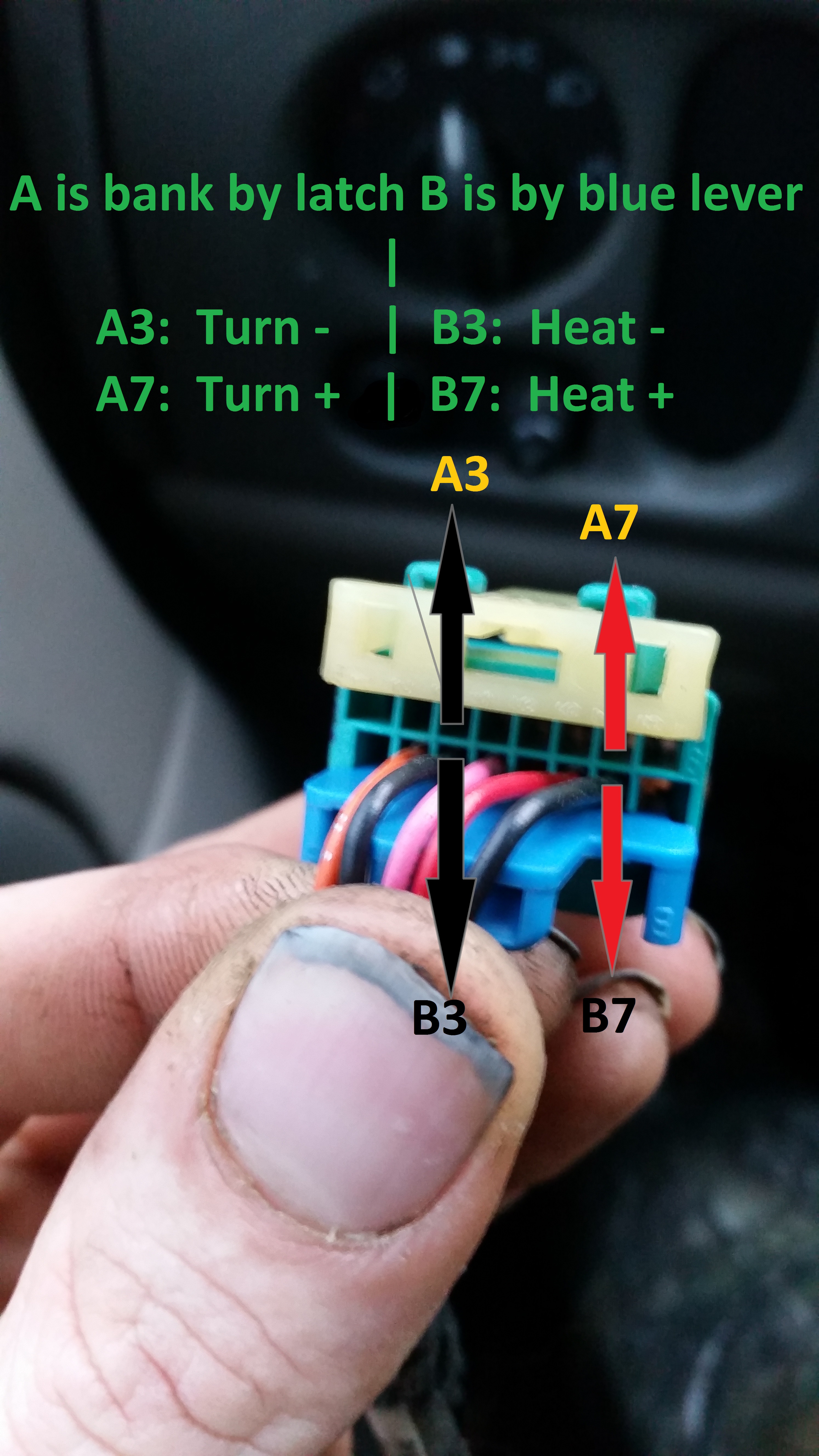 ON THE TOW MIRRORS THERE ARE 2 OR 3 CONNECTORS DEPENDING IF YOU GOT BACKUP LAMPS. BANK A IS BLUE HARNESS TOP ROW BY LATCH BANK B IS BLUE HARNESS BOTTOM ROW.