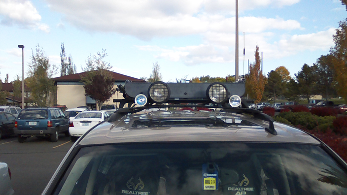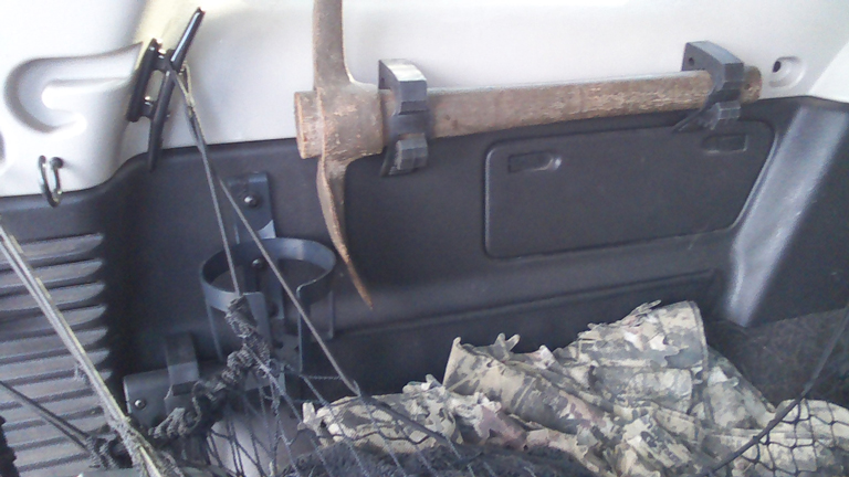I kept trying to find some kind of cover for when the tailgate was up, kind of a changing area. It needed to be waterproof, let the wind through, but provide enough cover. So I used a 3D camo blind, and then added hooks on the door. The finished result: