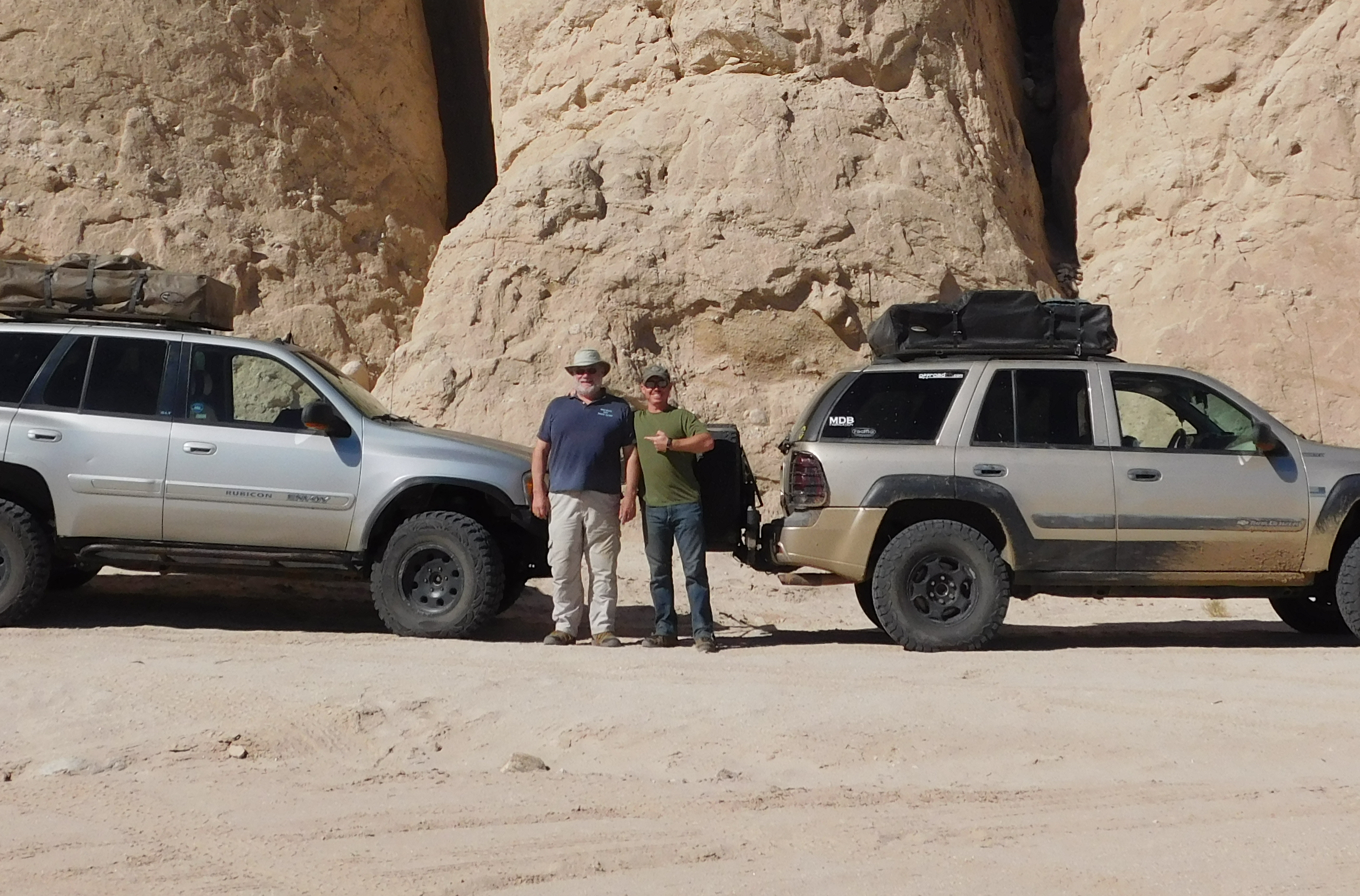 Exterior Modifications: MDB custom front bumper, MDB oil pan skid plate and MDB radiator skid plate (rhino lined), MDB Custom swing-open rear tire carrier, MotorSport Tech 1.5" spacers/adapters, Chevy Silverado Rims, BFG A/T KO2 33's (285/75R16), Fancy Envoy side mirrors with turn signal and defroster, Herculiner on Fenders, Doors, and Grille, 14ga SuperStrut roof rack cross bars, Smittybilt Roof Top Tent, MDB Rear swing-out tire/jerry can carrier.