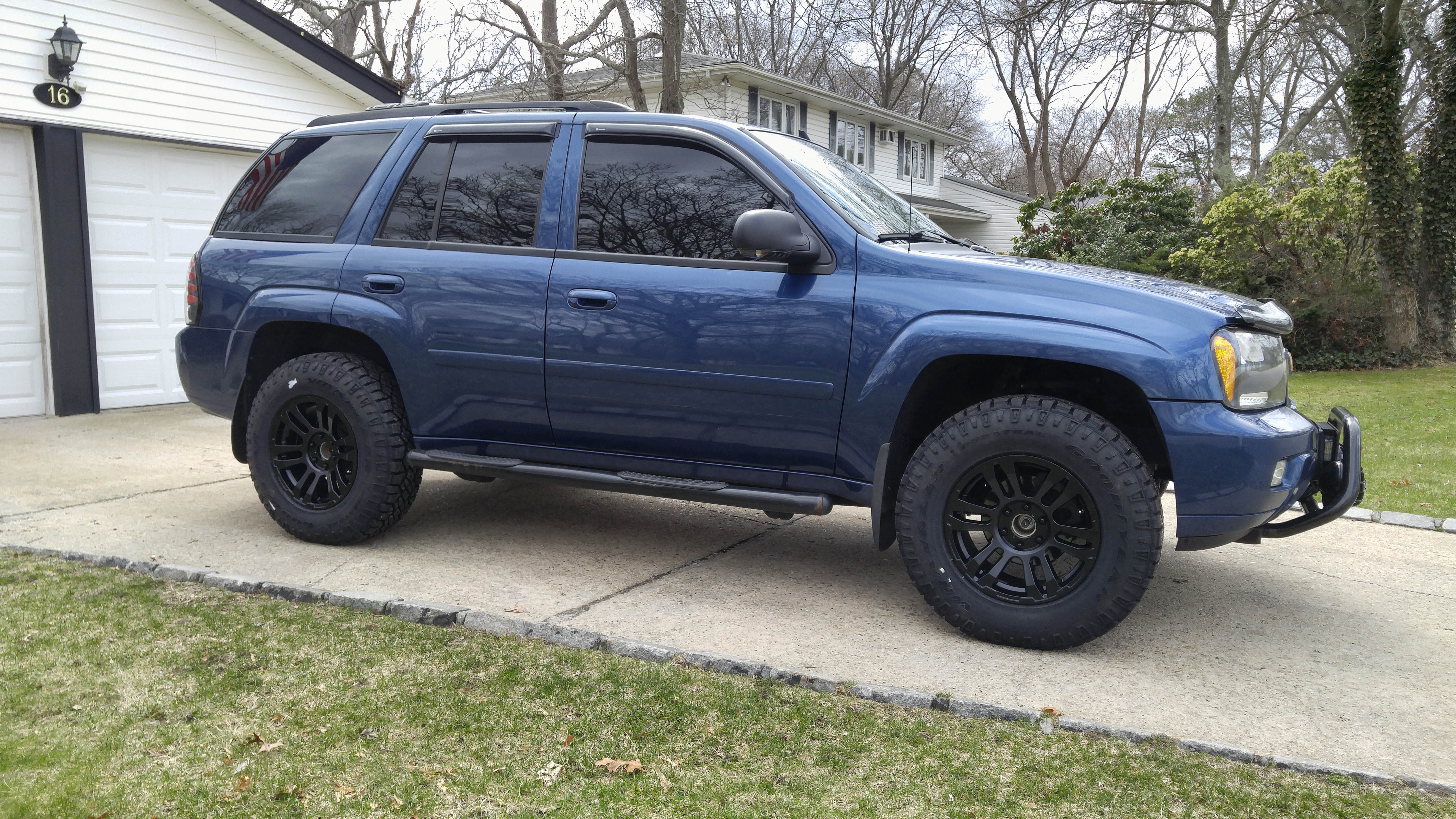 Changed out to MB TKO wheels (waiting on the center caps) with Wrangler Duratrac 255/75R17's, which required a little trimming. It more feels like a truck when driving and that's when I realized I should have upgraded the struts; the tires hit the top of the wheel well/fender at max flex... I discovered this cruising over an intersection a little above the speed limit