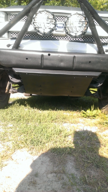 onto my custom rad skid plate. bought a piece of simple sheet metel. my brother works at an auto accesory shop and the were trowing away a bumper display mount. in the shape of an "H". i just cut the upper half off and the bolt holes lined right up for me on the bottom side of the bumper. cut some 45's on the ends to prevent some snagging and bolted her on. then i just zip screwed on the plate steel to create a skid
