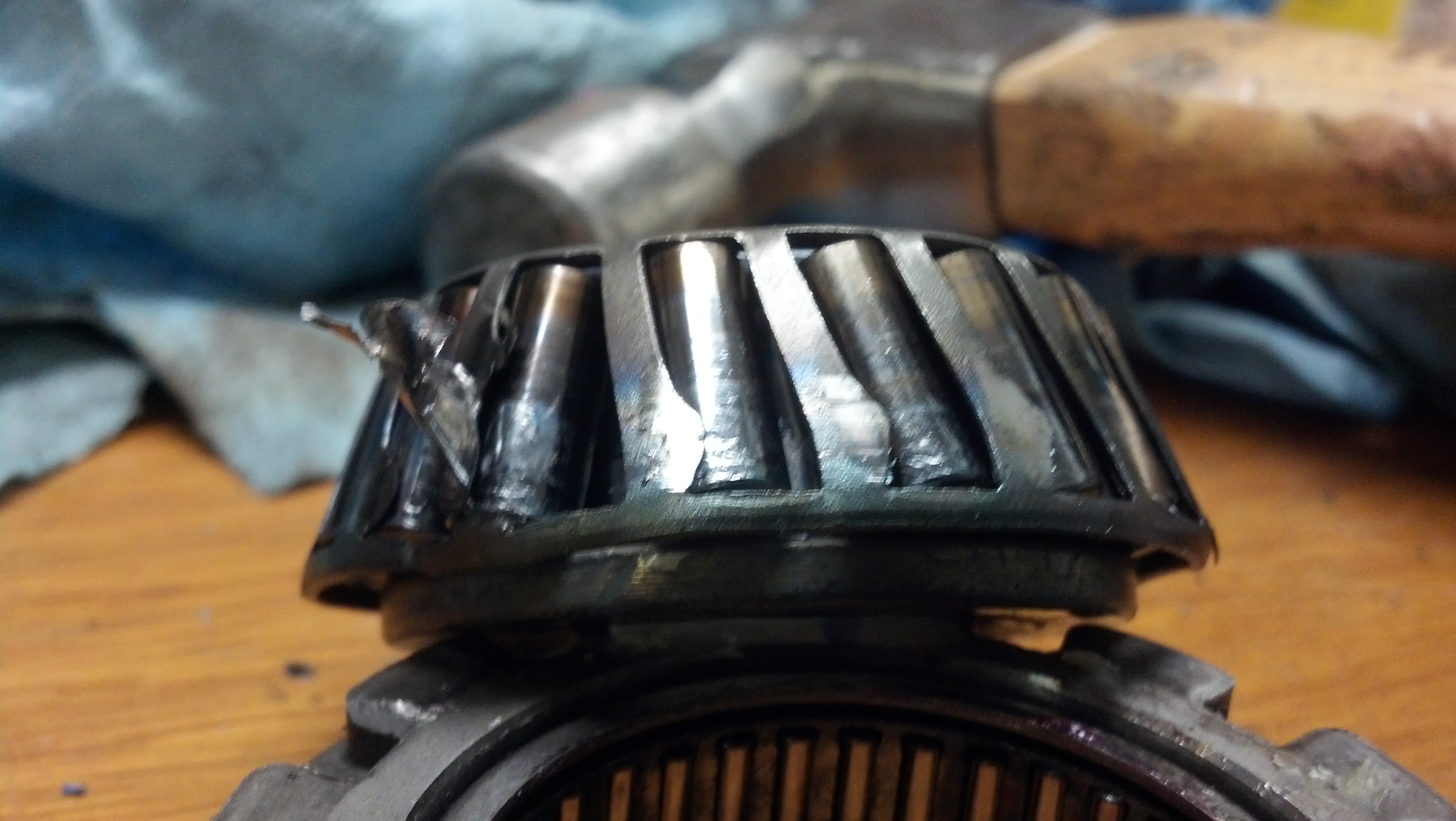 It seems the cage melted inside the bearing, seized up the pins, and then forced the pinion to attempt to rotate inside the inner race of the bearing until that galled up. My guess is that is why there are two distinct portions of ring gear teeth missing.