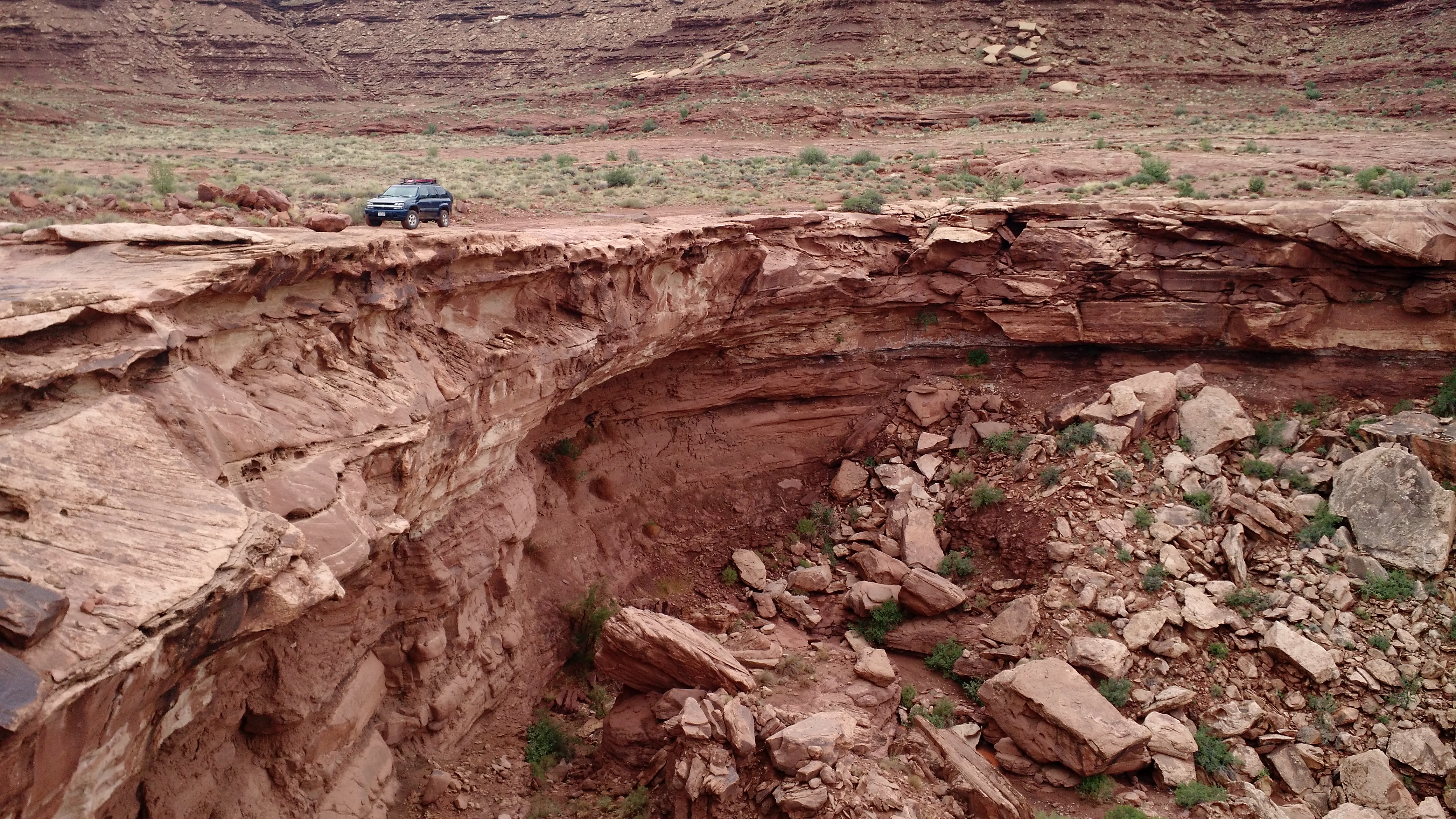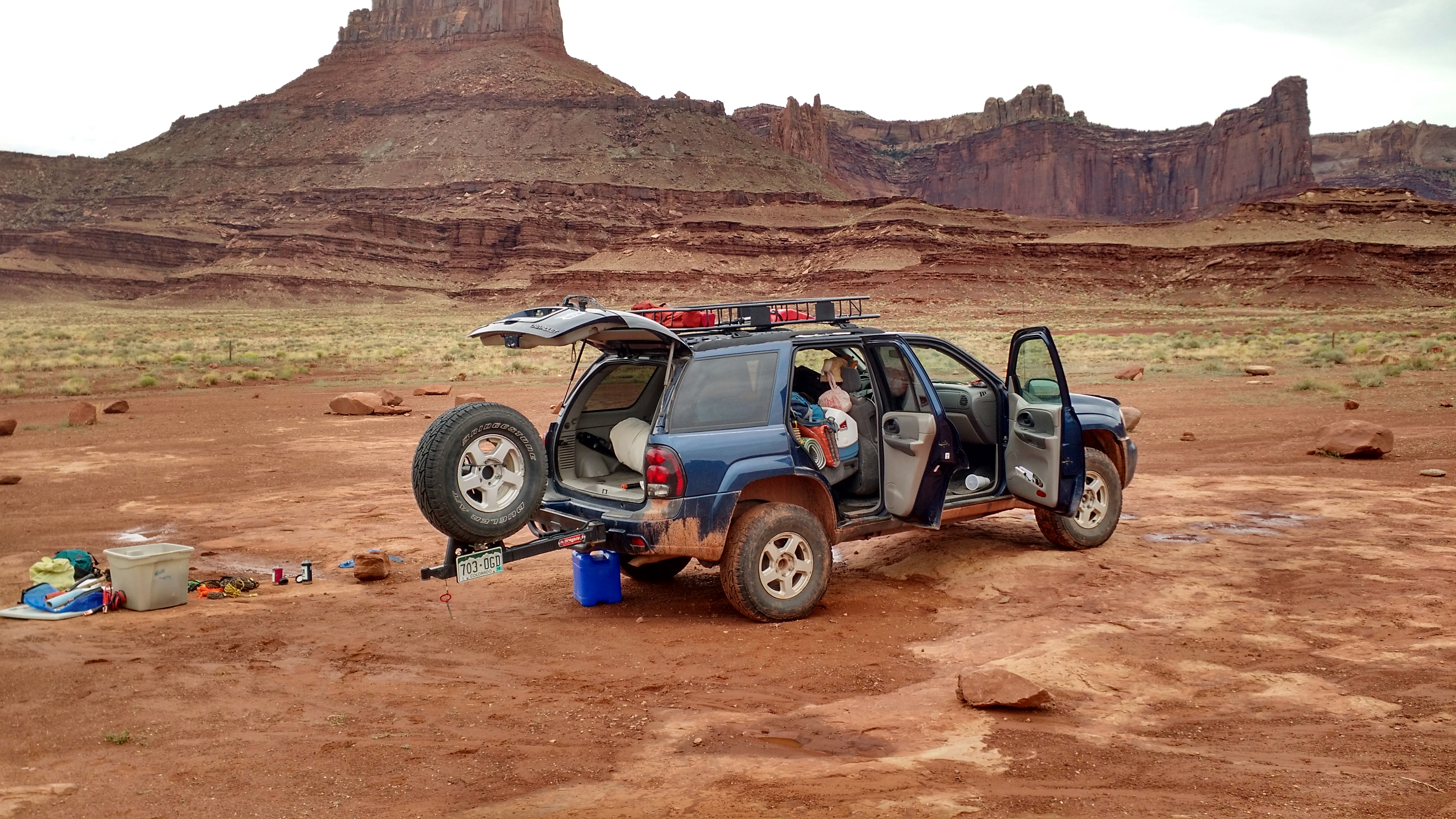It takes about six hours to get to Moab from Denver. We experienced heavy rain during some of that. After pulling over in Grand Junction, taking on as much fuel as we could and calling the ranger station in Moab to get the local weather/road report, we decided to enter the trail from Potash Rd. instead of going down the Shafer Trail from Island in the Sky. The latter option is simply too slick (red clay) and dangerous when wet.