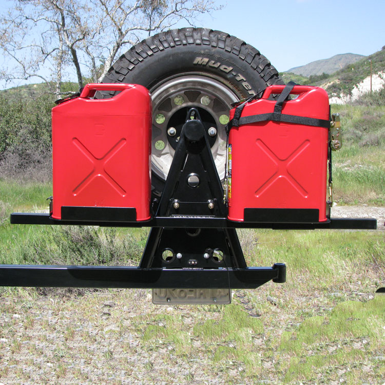 Wilco, the makers of Tiregate, make a jerry can holder for my device, but I have two problems with it. Firstly, it holds the cans very high and I wouldn't be able to open the rear window with cans that far in the air. Secondly, it costs $330 USD. Here's what their device looks like.