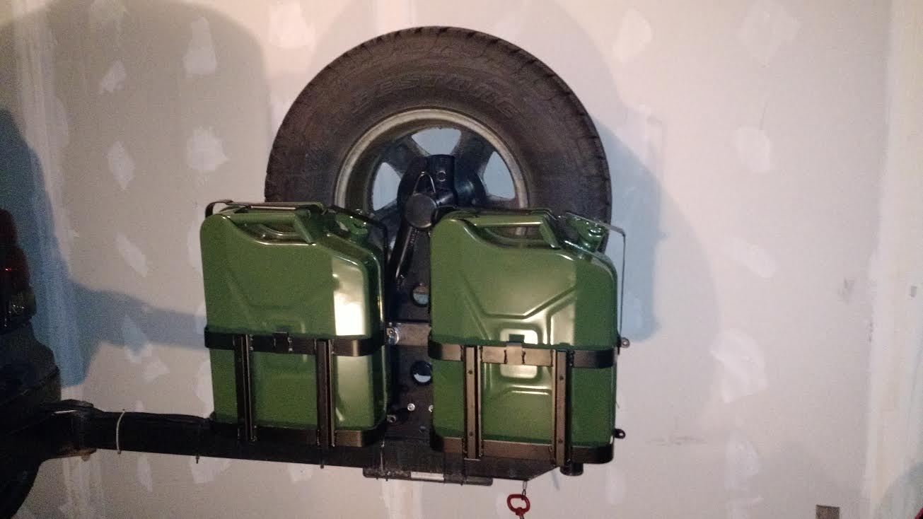 I decided to see if I could make my own alternative. I bought two jerry can holders on Amazon for $35 each and realized that I could mount them to the tiregate pretty easily. I went to Home Depot and bought several feet of 2"x3/8" steel bar, drilled and hole-dozed it to fit the 1" tiregate mounts, and mounted the jerry can holders directly to that. Another steel bar runs across the lower section and is bolted to the tiregate to ensure that the cans don't sway. It is primed and painted so it shouldn't rust.