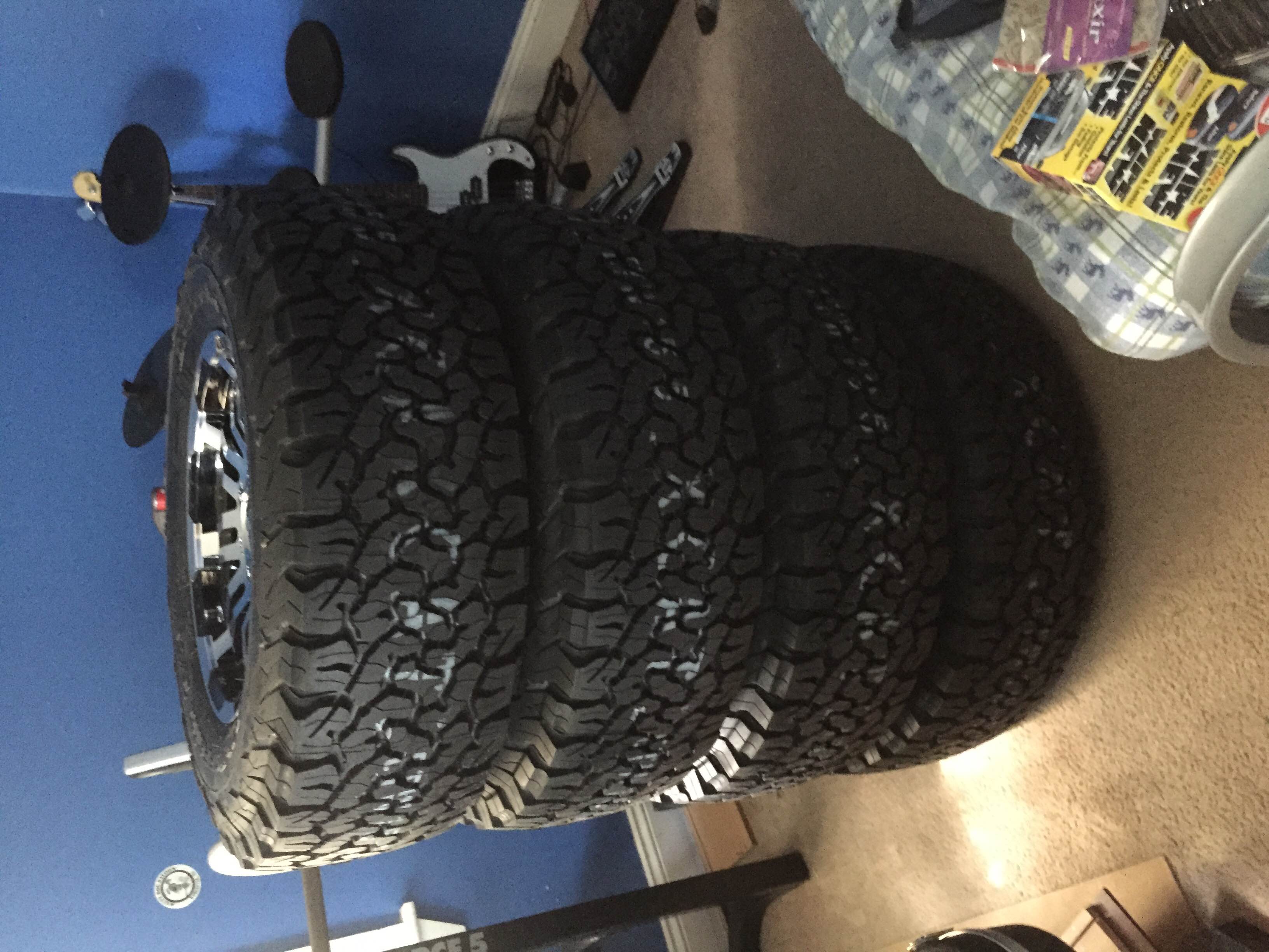 Just picked up my new wheels/tires today, BFG KO2 275/70R17 (32.2"). Figured id start off my review thread by my initial impression of the physical design/feel of the tires. The rubber definitely feels thicker/stiffer than the original KO's. The sipes run from top of tread completely through to the base of the tire, seems as if its going to handle pretty well in rain/snow (i live in MA so ill give my thoughts on both conditions as they come up). the spacing between the tread seems slightly larger than the KO's which looks like it will dislodge mud easier. Overall very good looking tire, pretty aggressive for an all terrain. I should have these installed later this week, so ill post some short term impressions few days after. Then i will post long term as well as off road impressions to give my thought's on various terrain.