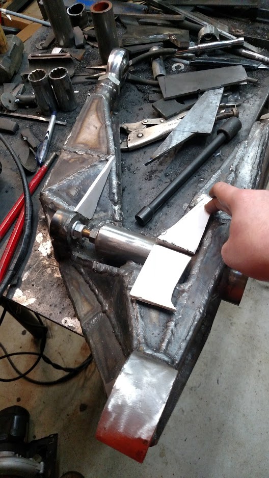 With some helpful input from Mr Barton and Mr Downing I added 5 lbs of steel to the A arm. Built a rear crossmember for the subframe and turned down a clevis I bought for another application so it'll fit in our rack. Then started on the other lower A arm. Given the ridiculous width I've got some thoughts in mind for fender flares that will take being rubbed on everything, cause after all, they probably will be. It'll probably look like shit like everything else. But it should work.