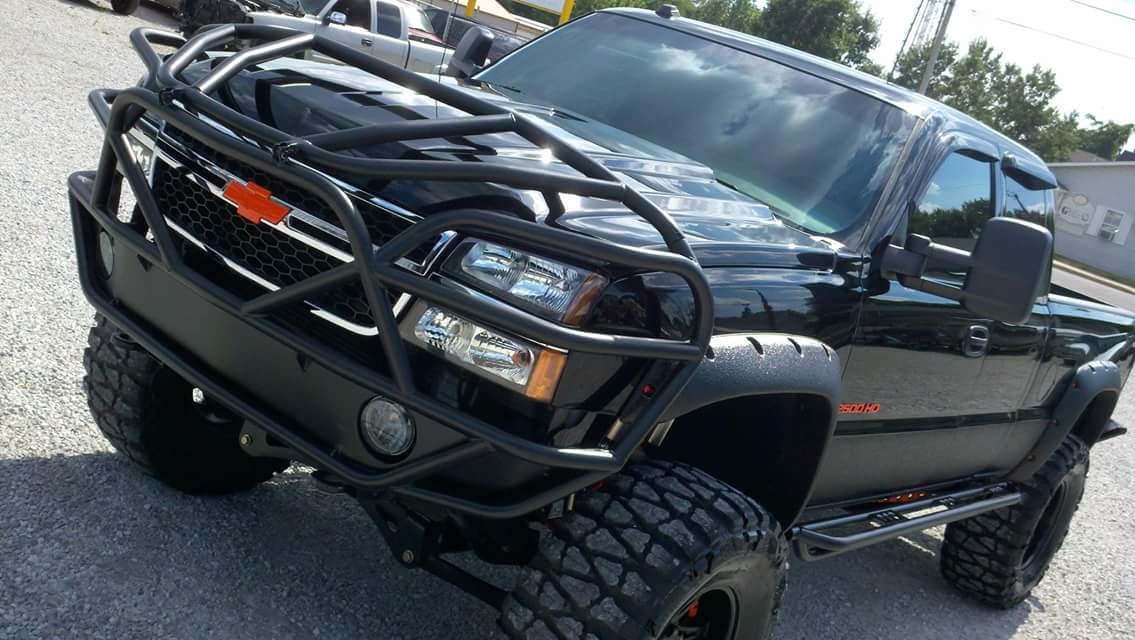 Awhile back in made a brush guard out of the factory steel sub bumper and some pipe. Looks good now that it finished for the most part, but I'm thinking of a redo after a pic of a bad ass guard on a Silverado I came across. Check out the pic on the truck and let me know what you think.
