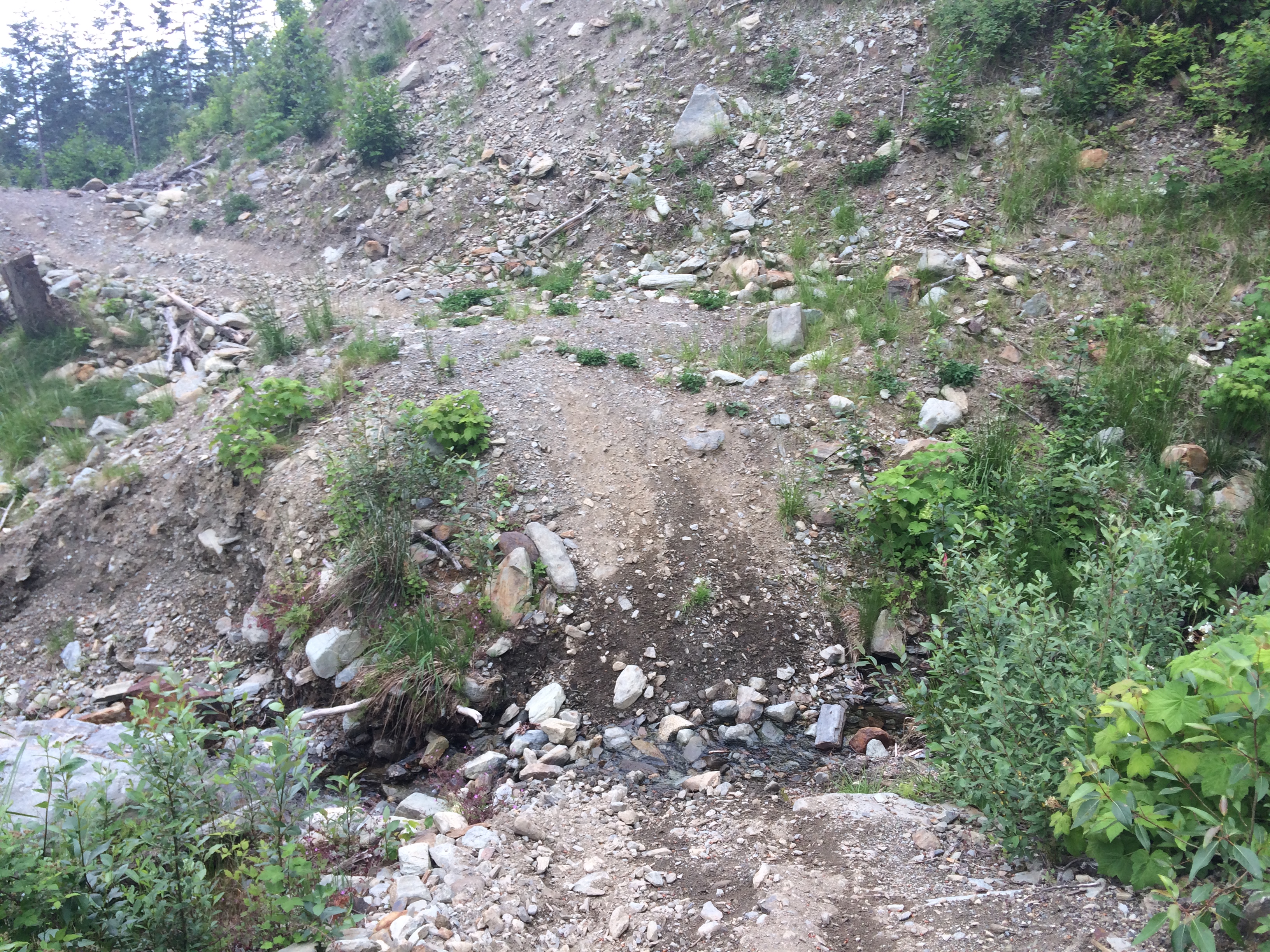 I had no such obligation, so I said my goodbyes to the guys, and headed a few km further east, to the Garnet/American FSR system. Conditions were much like those at Ruby Creek, though there was much more bear scat in evidence. I managed to get over the pass between the 2 creeks, but at just 11km from where the American Cr. FSR returns to pavement, came to a blowdown across the road, with a mudslide 80 meters further along, followed by a 5' deep x 15' wide washout just beyond that. I took that as a definite sign to backtrack the way I had come, call it a day, and head home for supper. Altogether, I cruised about 60km (40mi) of deteriorating logging roads today, so the truck and I are feeling a bit jostled and dusty.