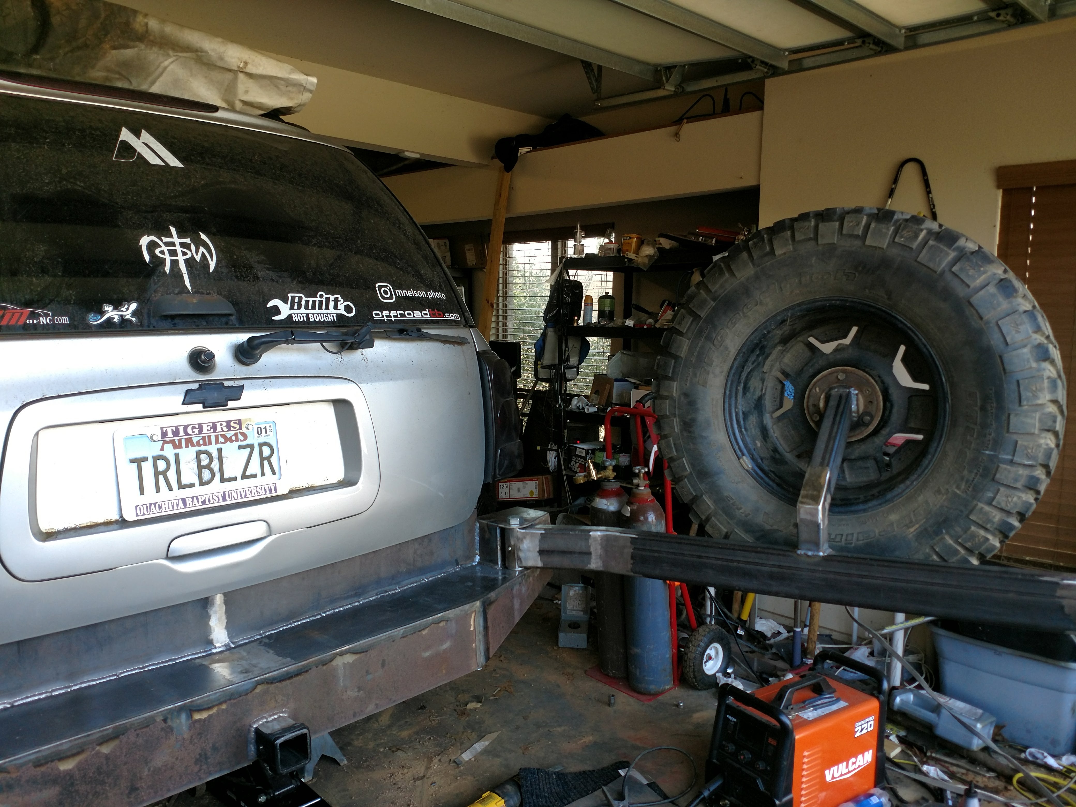 I've build most of the arm, tire mount, and passenger side of the main bumper. I added some more structure to the hinge side to minimize deflection when in the open position. I took a plasma cutter to an old front hub assembly for use as a tire mounting plate, which was full of grease and probably gave me cancer. After plasma, I ground the backside of it down relatively flat and welded it to a *45 on the end of some 2x2 to form the stick out angle. I had a piece of scrap laying on the ground from a hole saw that just so happened to fit perfectly in the center of the hub, so I used it to fill in the CV shaft hole and seal it all off. Did some more measuring and chopping until I came up with a good mounting stand and welded it to the arm. There is plenty of room for the back glass to open with the arm closed (new 35" tire shown), probably enough room for a 37".